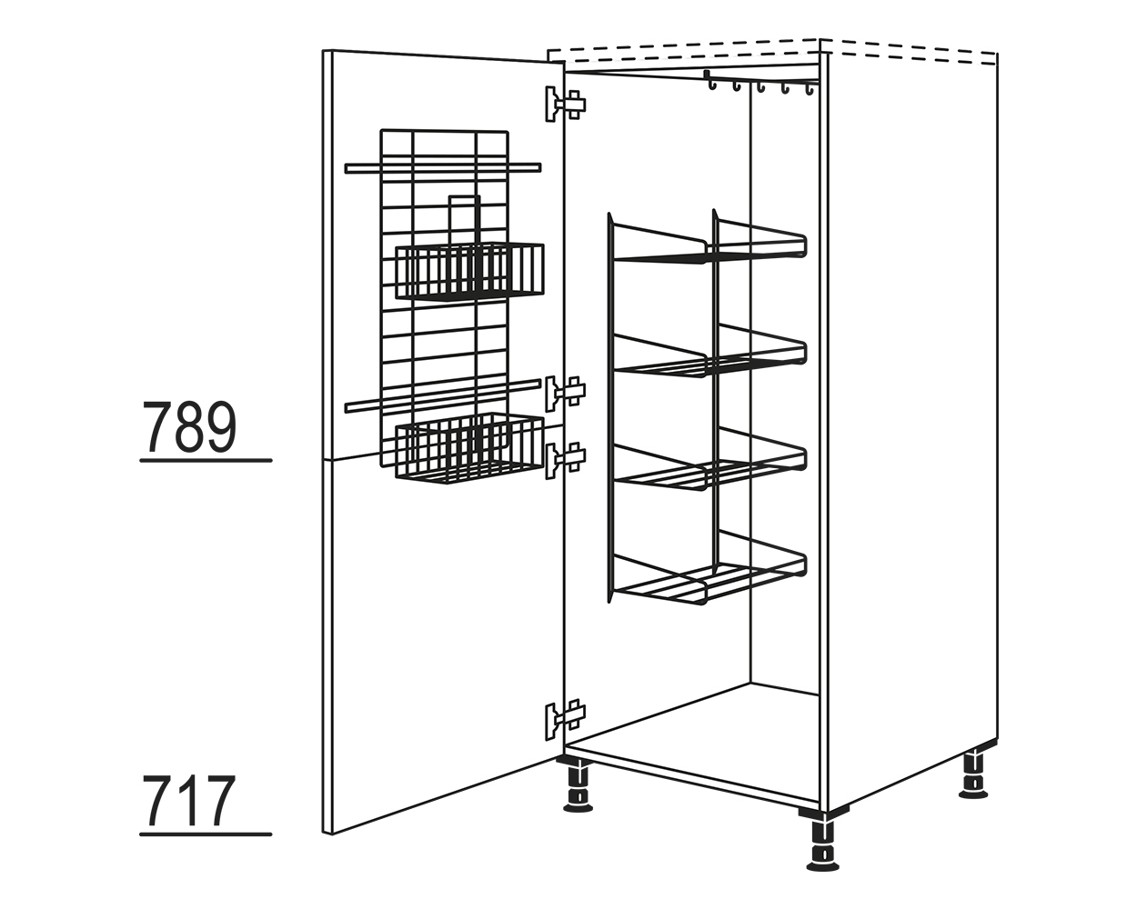 Armario escobero / para aparatos 1 puerta embridada, 1 rejilla de sistema, 2 cestas para productos de limpieza, 1 estantería de sistema, 1 portamangueras para la aspiradora, 2 barras de ganchos